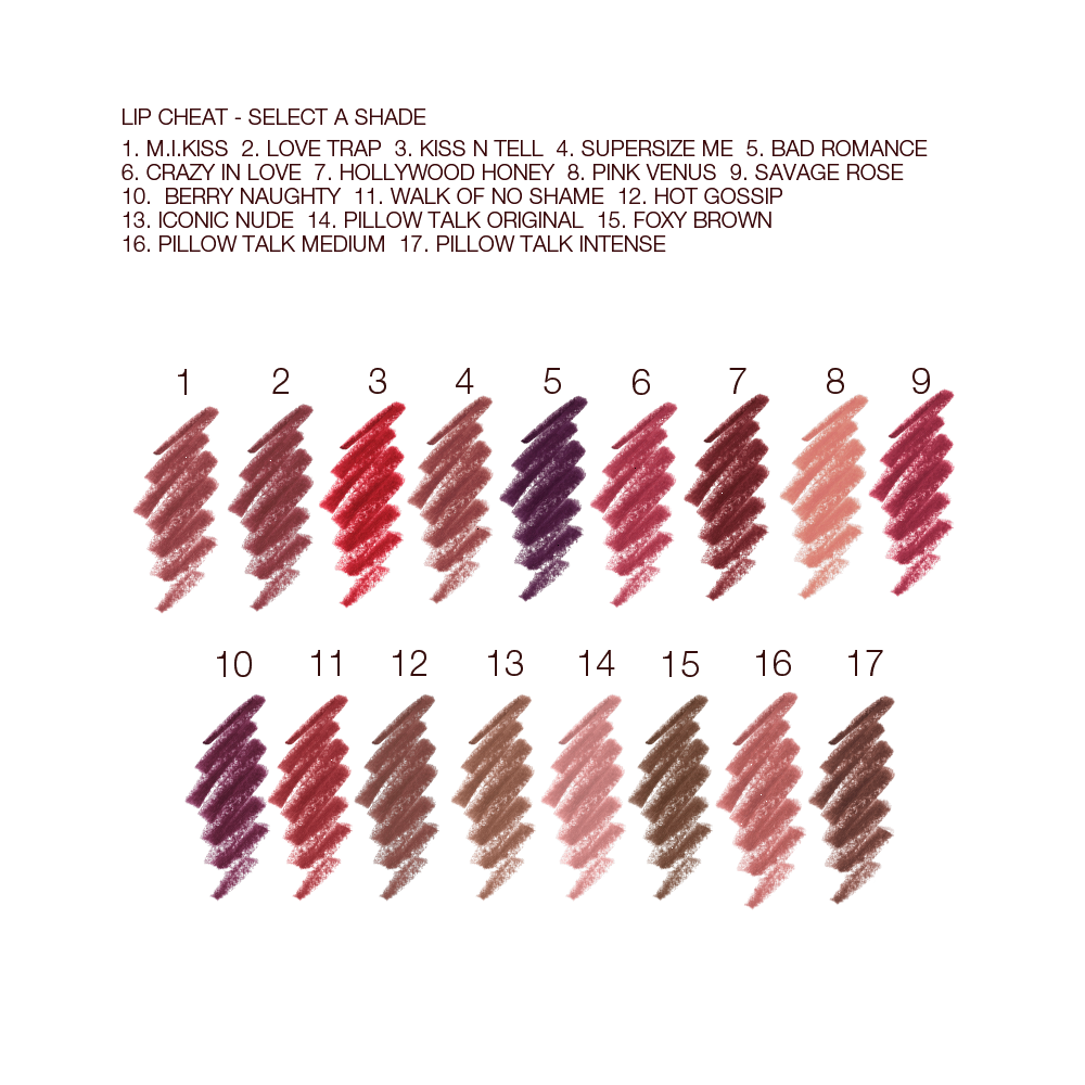 Lip Cheat lip liner in a shade of your choice: my backstage beauty secret for fuller, wider looking lips! The waterproof, velvety, long-lasting formula that glides over skin, helping to effortlessly re-shape and re-size the appearance of your lips! Select your shade from the collection of 17 pout-perfecting hues to add to your collection match your chosen Hot Lips lipstick!