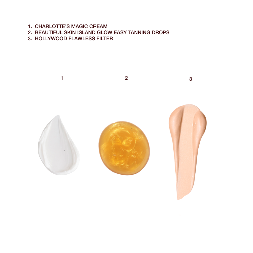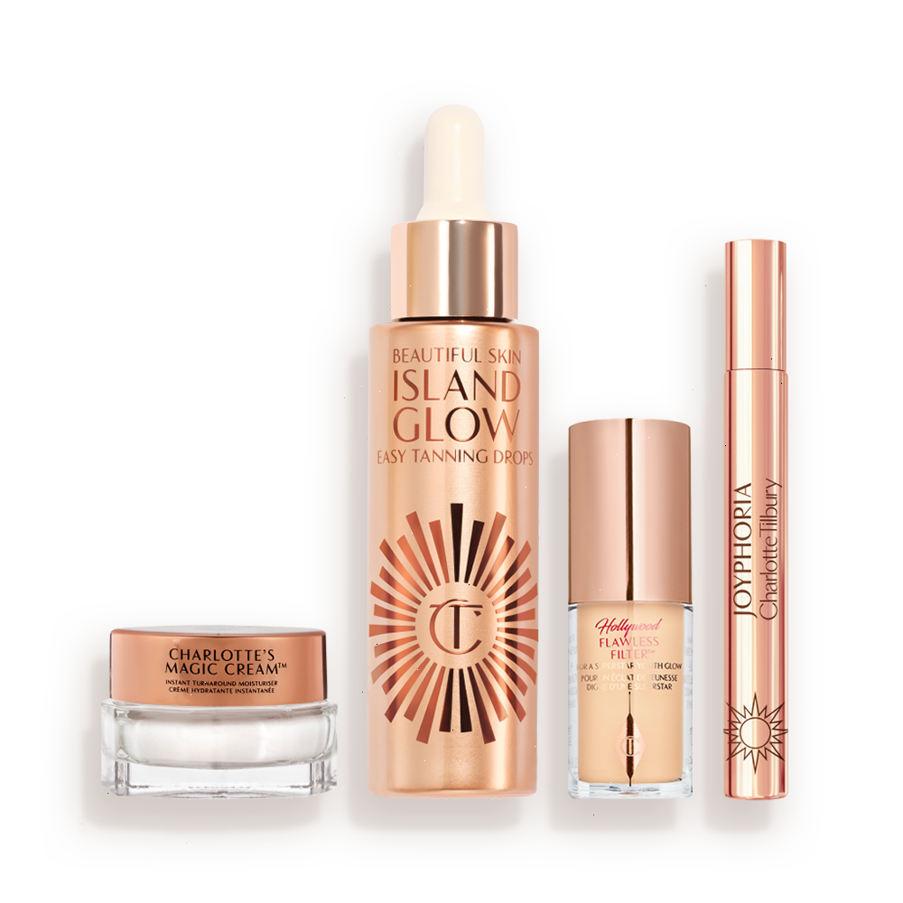 ONLY available on charlottetilburymart.com and the App, this kit includes Charlotte's Magic Cream 10ml, Beautiful Skin Island Glow Easy Tanning Drops, Mini Hollywood Flawless Filter and Joyphoria 10ml.